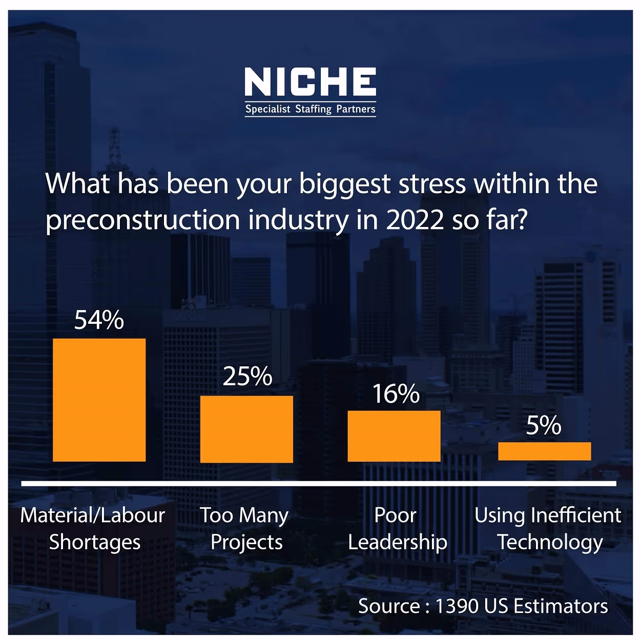A total of 1390 US based estimators took part in the poll, which sought their opinion about their “biggest stress” in the preconstruction sector. A quick look at the construction industry’s affairs reveals that it too faces material and labor shortages.